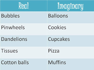 The objects in the imaginary column, are great when you do not have anything on hand, or for a child who loves to PRETEND.  "Watch me blow up this red balloon!"  Pretend to blow up a balloon, demonstrating deep breaths as you move your hands out to show how big it is.  "I'm passing it to you now!  Can you catch it, or pop it?"  "Now it's your turn to blow up a balloon!"  Pretending to pop the imaginary balloons can be a great way for them to de-stress as well.